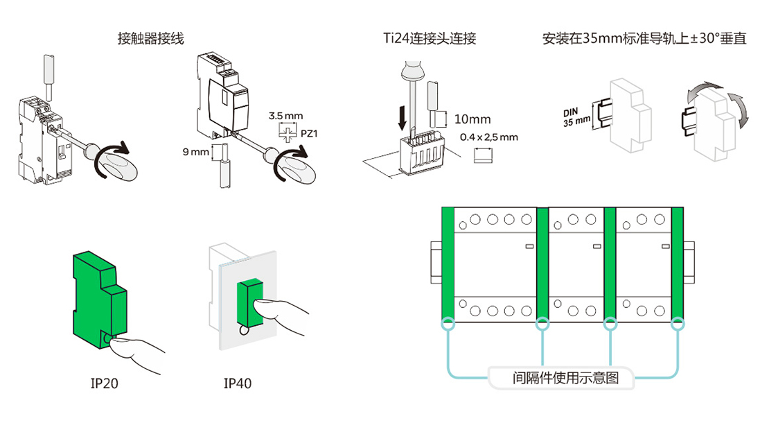 注:当接触器安装在配电箱内时,其两侧必须拼装间隔件,以利于散热。